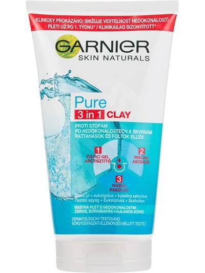 A tisztító agyaggal, eukaliptusszal és szalicilsavval gazdagított Garnier 3 az 1-ben Clay mélyen tisztítja és mattítja a bőrt. A termék háromféleképpen használható, tisztító gélként, arcradírként vagy maszkként.